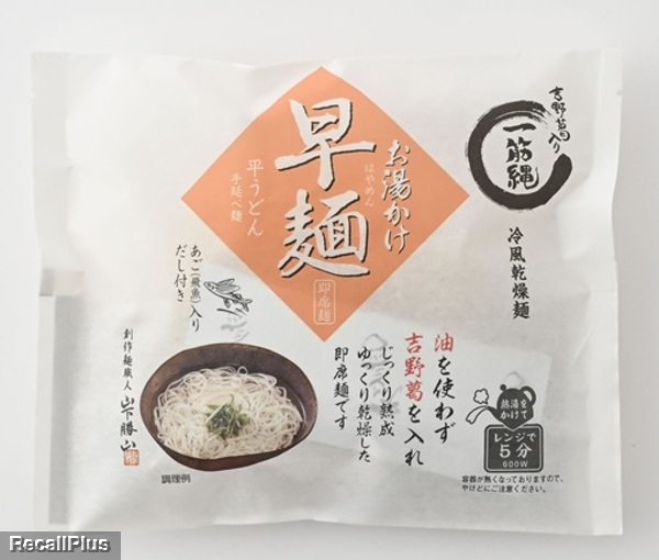 2024年12月25日-25年2月25日に販売した「お湯かけ 早麺 平うどん お湯かけ 早麺 そば」において、一括表示訂正用シールの誤貼付により、アレルゲン(そば)の欠落が判明したため、リコール(自主回収)する。これまで健康被害の報告はない。(リコールプラス編集部)