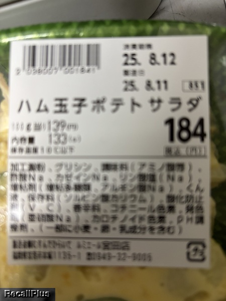 8月10日に、ルミエール宮田店で販売した「ハム玉子ポテトサラダ」において、「芋を味わうポテトサラダ」のラベルを貼って販売したことにより、アレルゲンの「乳」の表示が欠落したため、リコール(自主回収)する。これまで健康被害の報告はない。(リコールプラス編集部)