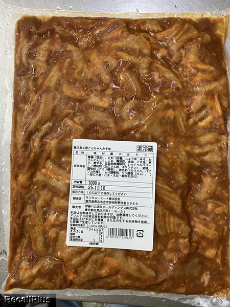「➀鹿児島工房とんちゃんみそ味(冷蔵) ➁鹿児島工房とんちゃんみそ味(冷凍) ➂鹿児島県産黒豚とんちゃん(冷蔵) ③鹿児島工房豚味付けホルモンみそ味(冷凍)」において、一部商品に加熱不十分なものが発生している可能性が判明したため、リコール(自主回収)する。これまで健康被害の報告はない。(リコールプラス編集部)