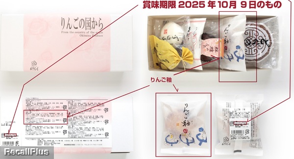 2025年9月23日-10月4日にアバンセゆめタウン廿日市店で販売した「りんご釉 1個入」、2025年9月23日-29日にJR浦和駅東西連絡通路「秋田産直市」、2025年9月24日-30日に阪急百貨店うめだ本店地下1階四季折々イベントスペースで販売した「りんご釉 3個入」「りんごの国から」の一部において、カビによる汚染が判明したため、リコール(自主回収)・交換または返金する。これまで健康被害の報告はない。(リコールプラス編集部)