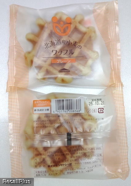 2025年10月12日-14日にシャトレーゼ武豊店で販売した「北海道産小麦のワッフル プレーン」において、 賞味期限を「25.10.18」とすべきところ、誤って「25.10.27」と印字したため、リコール(自主回収)・返金する。これまで健康被害の報告はない。(リコールプラス編集部)