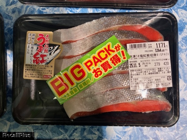 2025年10月16日に、PLANT高島店で販売した「冷凍うま塩紅鮭切身BIGPACK 中身は冷蔵の「うま塩紅鮭切身(BIGパック)」」において、冷蔵販売であれば本来「消費期限2025年10月20日」となるが、冷凍販売時の期限である「賞味期限11月5日」の表示で販売したため、リコール(自主回収)する。これまで健康被害の報告はない。(リコールプラス編集部)