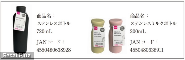 ダイソー店舗で販売した「ステンレスボトル 720mL、ステンレスミルクボトル 200mL」の一部において、電解研磨液が容器内部に空いた穴より断熱層へ浸入し、漏れ出た可能性があることから、リコール(自主回収)する。(リコールプラス編集部)