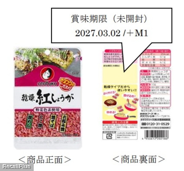 「乾燥紅しょうが 10g」の一部において、賞味期限の表示に誤り(本来「2027 年 1 月 2 日」と表示すべきところ、「2027 年 3 月 2 日」と誤って印字)が判明したため、リコール(自主回収)する。当該製品の品質には問題なく、健康への影響はない。(リコールプラス編集部)