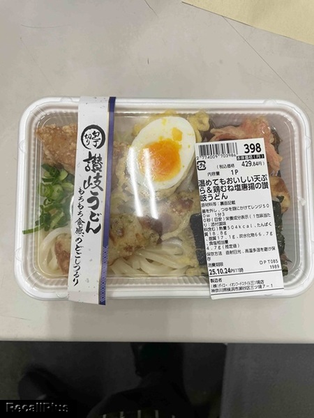 2025年10月23日に、イオンフ-ドスタイル三ツ境店で販売した「温めてもおいしい天ぷら&鶏むね唐揚の讃岐うどん」において、「鶏タル讃岐うどん」のラベルを誤貼付して販売してしまい、アレルゲン(ゼラチン)の表示が欠落したため、リコール(自主回収)する。これまで健康被害の報告はない。(リコールプラス編集部)