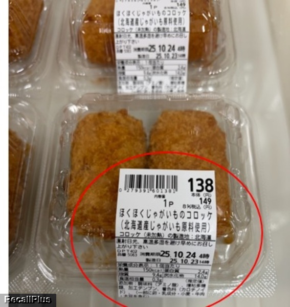 2025年10月23日に、マルエツ溝の口店で販売した「サクッと衣のクリーミーコロッケ2個」において、誤って「ほくほくじゃがいものコロッケ(北海道じゃがいも使用)」のラベルを貼付し、異なった添加物、アレルギー、栄養成分表示をしたため、リコール(自主回収)する。これまで健康被害の報告はない。(リコールプラス編集部)