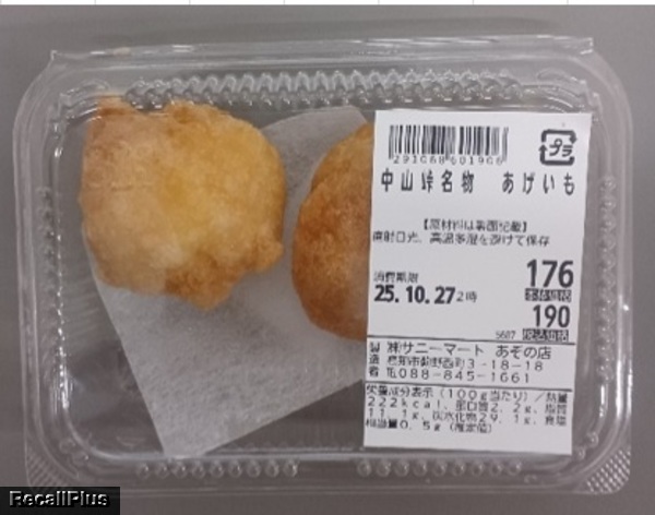 令和7年10月25日に、サニーマートあぞの店で販売した「中山峠名物あげいも」において、製造をてんぷら粉で製造(レシピは芋天ぷら粉)したことにより、天ぷら粉に含まれるアレルギー「卵」のアレルギー表示欠落が判明したため、リコール(自主回収)する。これまで健康被害の報告はない。(リコールプラス編集部)