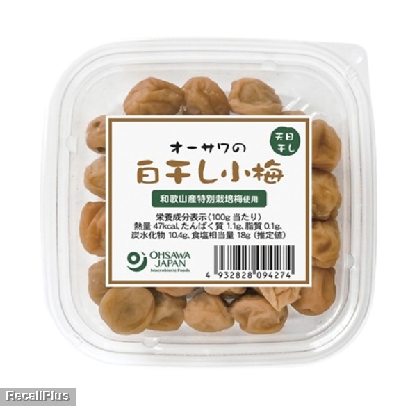 2025年9月14日-2025年10月13日に、全国の自然食品店、ネット販売店、量販店などで販売した「オーサワの白干し小梅」において、カビによる汚染が判明したため、リコール(自主回収)する。これまで健康被害の報告はない。(リコールプラス編集部)