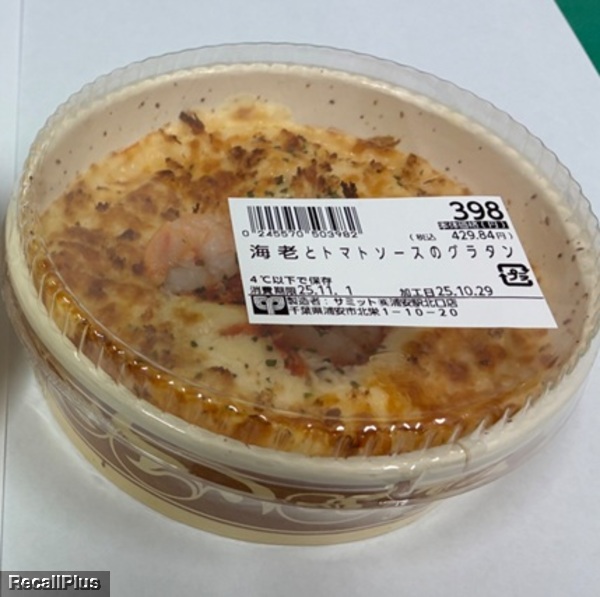 2025年10月28日、10月29日に、サミット浦安駅北口店で販売した「海老とトマトソースのグラタン」において、要冷蔵商品(4℃以下保存)を常温で販売したため、リコール(自主回収)する。これまで健康被害の報告はない。(リコールプラス編集部)