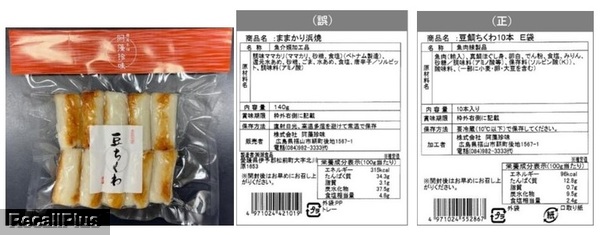 2025年10月20日-27日に おみやげ街道桃太郎で販売した「ままかり浜焼」と「豆鯛ちくわ10本 E袋」において、別商品の食品一括表示を含むラベルシールを貼付し、原材料名や保存方法等の誤表示、アレルギー表示「ごま」「小麦・卵・大豆」の欠落が判明したため、リコール(自主回収)・返金する。(リコールプラス編集部)