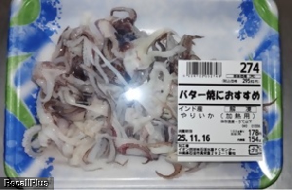 10/30-11/2にMV(6店舗)で販売した「インド産やりいか(加熱用)」において、本来、製造日から2日間を消費期限として表示販売すべきところを、+12日間の消費期限を表示して販売され、解凍商品である旨を示す「解凍」の表示が欠落し、保存温度「4℃以下」とすべきところを「-5℃以下」以下と誤表示されたため、リコール(自主回収)する。これまで健康被害の報告はない。(リコールプラス編集部)