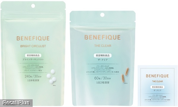「ベネフィーク ブライトサーキュリスト、ベネフィーク ザ・クリア」において、使用した原料「混合ハーブエキス」「シベリア人参エキス」の一部ロットに医薬品成分(エフェドリン)が微量混入していた可能性が確認されたため、リコール(自主回収)する。極めて微量であり健康への影響はない。(リコールプラス編集部)
