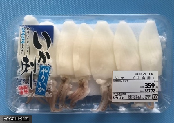 いなげや 49店舗で販売した「いか刺し、やりいか」において、マルハニチロ(納入者)が賞味期限の切れた冷凍製品(-18℃以下)を誤っていなげやに納品し、いなげや49店舗にて当該製品を解凍して販売したため、リコール(自主回収)する。これまで健康被害の報告はない。(リコールプラス編集部)