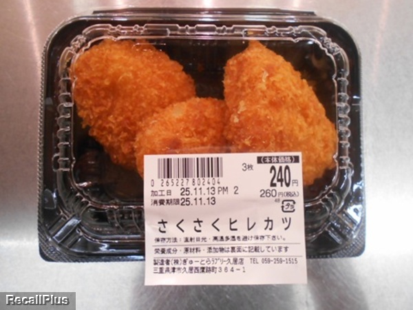 2025.11.13に、ぎゅーとらラブリー久居店で販売した「さくさくヒレカツ」において、商品の入れ間違いが発生している事が判明し、「海老」「いか」のアレルギー表示が欠落したため、リコール(自主回収)する。これまで健康被害の報告はない。(リコールプラス編集部)