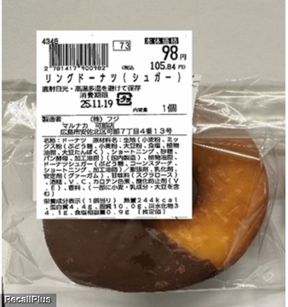 2025年11月19日に、マルナカ可部店で販売した「リングドーナツ(シュガー)」において、「オールドファッション(チョコ)」に「リングドーナツ(シュガー)」のラベル誤貼付により、アレルゲン表示「卵」の欠落が判明したため、リコール(自主回収)する。これまで健康被害の報告はない。(リコールプラス編集部)