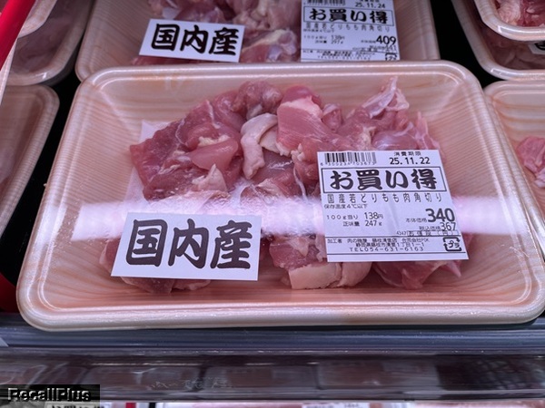 11月16日に販売した「①若どりもも肉角切り100g ②国産豚肉ミンチ(ジャンボパック) 100g」において、消費期限が25・11・20が正しい日付に対して消費期限が26・2・20と誤った商品を販売したため、リコール(自主回収)する。これまで健康被害の報告はない。(リコールプラス編集部)