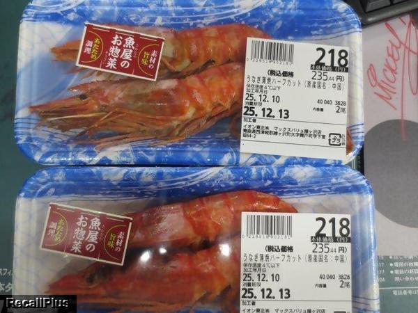 2025年12月10日に、マックスバリュ鯵ヶ沢店で販売した「【魚総菜】アルゼンチン赤えび塩焼き」において、消費期限の誤表記「【正】2025年12月11日AM8時 【誤】2025年12月13日」、特定原材料「えび」の表示欠落が判明したため、リコール(自主回収)する。これまで健康被害の報告はない。(リコールプラス編集部)