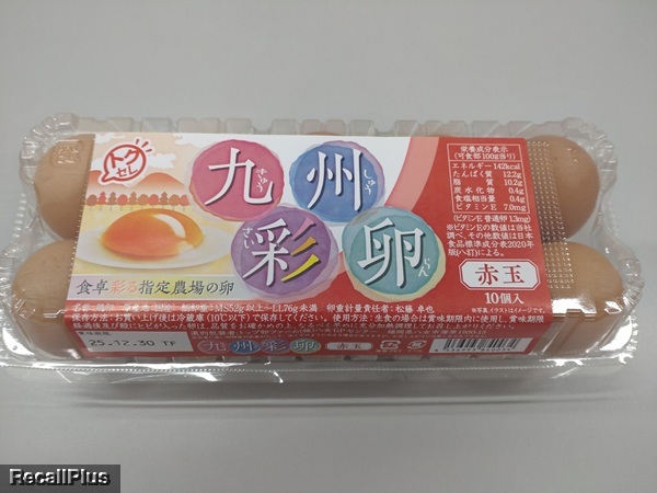 2025/12/12-2025/12/13に、福岡県、佐賀県の西鉄ストアで販売した「九州彩卵 赤玉 10個入パック」において、賞味期限の誤表示「 誤)賞味期限[25.12.30TF] 正)賞味期限[25.12.29TF]」が判明したため、リコール(自主回収)する。これまで健康被害の報告はない。(リコールプラス編集部)