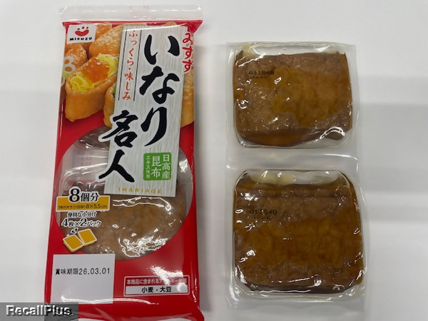 2025年12月8日-12月15日に、関東地区、中京地区、滋賀県の小売店で販売した「いなり名人MA(4個×2)」において、パック内に製造ライン上の汚れが混入した可能性があるため、リコール(自主回収)する。これまで健康被害の報告はない。(リコールプラス編集部)