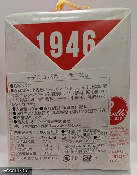 2025年11月6日-12月15日にオーケー169店舗で販売した「テデスコ パネトーネ 100g」の一部において、カビの発生が確認されたため、リコール(自主回収)・返金する。これまで健康被害の報告はない。(リコールプラス編集部)