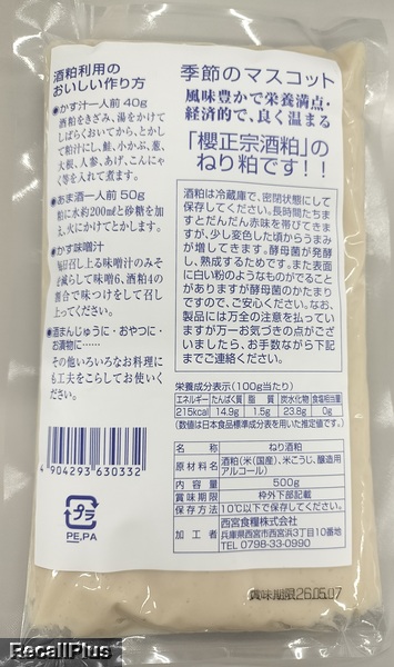 2025年12月12日-17日に櫻正宗記念館「櫻宴」ショップで販売した「ねり酒粕(500g)」において、製造過程で微生物と考えられる異物が混入している可能性があるため、リコール(自主回収)・返金する。これまで健康被害の報告はない。(リコールプラス編集部)