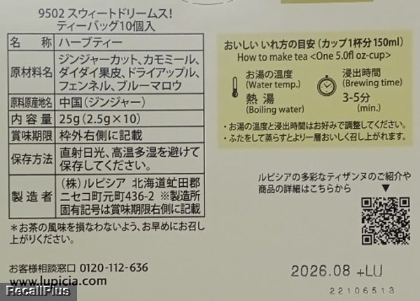 2025年11月19日-12月10日に47店舗で販売した「9506 ELDERFLOWER&CHAMOMILE(エルダーフラワー&カモミール) ティーバッグ 10個定番デザインBOX入」の一部パッケージ(箱)に、誤って「9502 SWEET DREAMS!(スウィートドリームス!)ティーバッグ 10個定番デザインBOX入」の中身がセットされ、アレルゲン「りんご」表示の欠落、パッケージに記載のない原料の使用が判明したため、リコール(自主回収)・交換する。これまで健康被害の報告はない。(リコールプラス編集部)