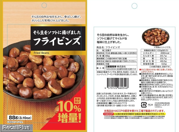 2025年10月23日-12月23日に全国のダイソー店舗で販売した「フライビンズ 10%増量」に、誤って皮付ピーナッツが包装され、アレルゲン「ピーナッツ 」表示の欠落が判明したため、リコール(自主回収)・返金する。これまで健康被害の報告はない。(リコールプラス編集部)