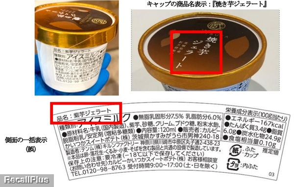 「蔵出し焼き芋かいつか」の4店舗で販売された『焼き芋ジェラート』の一部において、カップ側面に貼付されている一括表示ラベルの内容が、姉妹商品『紫芋ジェラート』の表示内容となっていることが判明したため、リコール(自主回収)する。アレルゲン表示に誤りはない。(リコールプラス編集部)