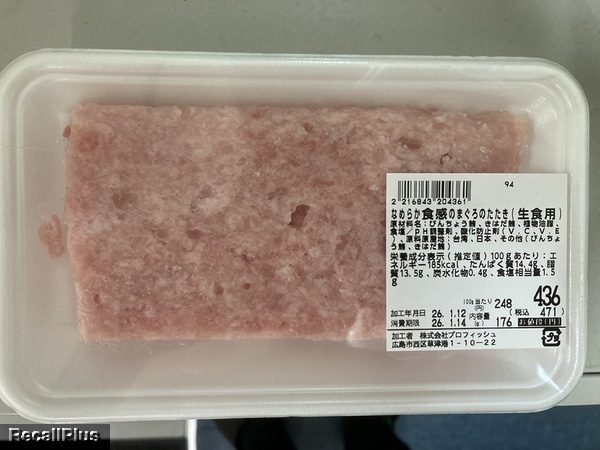 2026年1月12日に、広島県中心、山口県、岡山県 のフレスタ64店舗 で販売した「なめらか食感のまぐろのたたき(生食用)」において、保存温度帯表示(要冷蔵4℃以下)の欠落が判明したため、回収する。これまで健康被害の報告はない。(リコールプラス編集部)