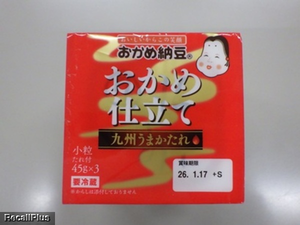 2026年1月7日-1月11日に、山口県、福岡県、佐賀県、長崎県、熊本県、大分県、宮崎県、鹿児島県、沖縄県の主に小売店で販売した「おかめ仕立てミニ3 九州うまかたれ」において、発酵不良(納豆特有の粘りと糸引きがない)の商品がある事が判明したため、リコール(自主回収)する。これまで健康被害の報告はない。(リコールプラス編集部)
