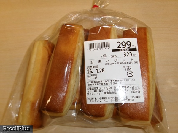 2026年1月26日に、ツルヤ青木島店で販売した「石窯バゲット(中身は「北海道ミルクパン」)」において、『卵・乳成分・大豆』の表示欠落が判明したため、リコール(自主回収)する。これまで健康被害の報告はない。(リコールプラス編集部)