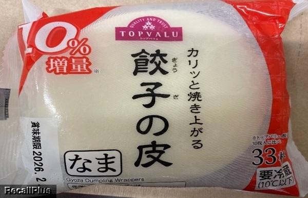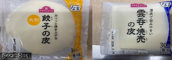 2026年1月22日にイオンスタイル金剛で販売した「①トップバリュ餃子の皮大判 ②トップバリュ雲吞・焼売の皮 ③トップバリュ餃子の皮10%増量 ④トップバリュベストプライスうす皮タイプ餃子の皮 ⑤トップバリュ餃子の皮大判うす皮」において、冷蔵ケースの通常管理温度帯「0℃-4℃」のところ、誤って「8℃-14℃」で販売したため、リコール(自主回収)・返金または交換する。これまで健康被害の報告はない。(リコールプラス編集部)