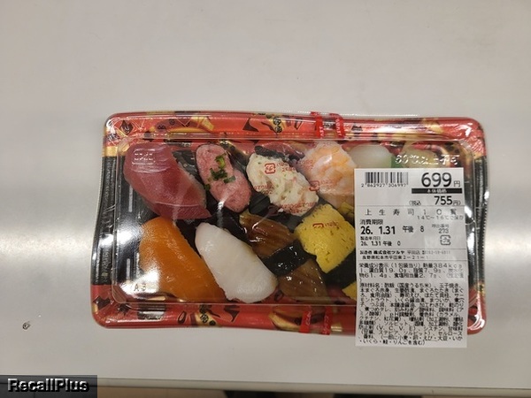 2026年1月31日に、ツルヤ平田店で販売した「上生寿司10貫の商品ラベルが貼付された、中身が特製生寿司9貫の商品」において、特定原材料及び特定原材料に準ずるもの「乳成分・かに・ゼラチン」の表示欠落が判明したため、リコール(自主回収)する。これまで健康被害の報告はない。(リコールプラス編集部)