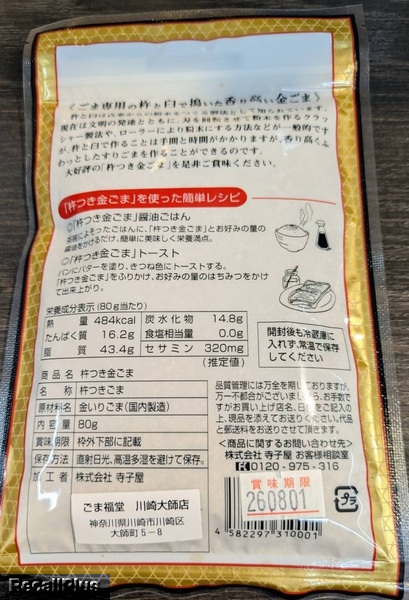 2026年2月5日-7日にごま福堂 川崎大師店で販売した「杵つき金ごま」において、賞味期限を「26.08.01」とすべきところ、誤って「27.08.01」と長く表記したため、リコール(自主回収)・交換または返金する。これまで健康被害の報告はない。(リコールプラス編集部)