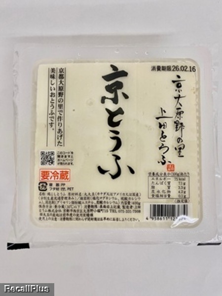 2026年2月11日に、ショップ5条、アイハート堀川、アルプラザ京田辺、豆腐工房うえ田本店、豆腐工房うえ田高槻店、鞍楽ハウディで販売した「①京とうふ ②善峰京とうふ」において、消費期限の誤表示「 一部の商品に誤表示 誤)消費期限2026年8月14日 正)消費期限2026年2月14日」が判明したため、リコール(自主回収)する。これまで健康被害の報告はない。(リコールプラス編集部)