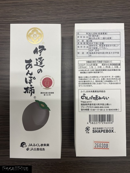 2026年2月13日-2月15日に、①のもの東京店、②のもの秋葉原店で販売した「伊達のあんぽ柿」において、賞味期限表示の欠落、「本来の期限は26.03.08」が判明したため、リコール(自主回収)する。これまで健康被害の報告はない。(リコールプラス編集部)