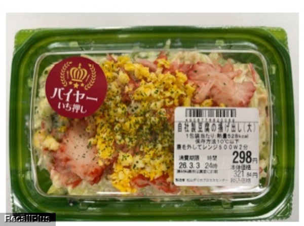 2026年3月2日に、株式会社フジのマルナカおよびMV屋号店舗で販売した「自社製豆腐の揚げ出し(大)【正しくは、彩りコールスローサラダ(大)】」において、ラベル誤貼付により、アレルゲンである「卵」、「乳成分」、「えび」、「かに」、「豚肉」、「リンゴ」の欠落が判明したため、リコール(自主回収)する。これまで健康被害の報告はない。(リコールプラス編集部)