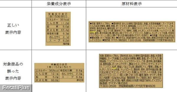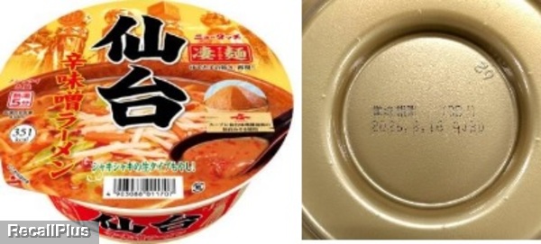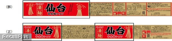 「ニュータッチ 凄麺 仙台辛味噌ラーメン」の一部商品において、誤って旧デザインのカップを使用し、原材料、栄養成分表示の一部が事実と異なるため、リコール(自主回収)・返金する。旧デザインのカップを使用した商品は、アレルゲン表示等の健康に関わる部分に誤記はなく、食べても問題はない。(リコールプラス編集部)