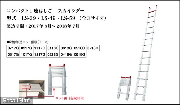 「はしご(伸縮式、アルミニウム合金製):コンパクト1連はしごLS(スカイラダー)」において、昇降時にロックピンが外れてステップが縮み落下等につながるおそれがあるため、リコール(自主回収)する。(リコールプラス編集部)