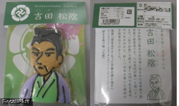R8.1.12-R8.3.9に、道の駅萩往還、やなぎだ万栄新幹線口、やなぎだ万栄宇部空港、萩明倫学舎、松陰神社前売店、アトラス萩店で販売した「松下村塾cookie」において、卵のアレルギー表示欠落が判明したため、リコール(自主回収)する。(リコールプラス編集部)