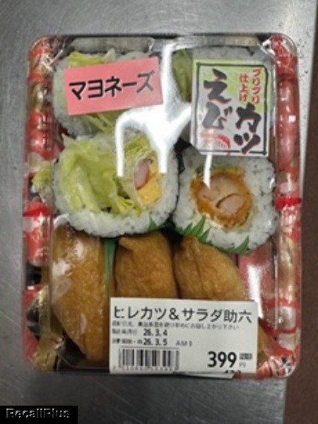 2026年3月4日に、マルキョウ千早店で販売した「エビカツ&サラダ助六」において、「ヒレカツ&サラダ助六」のラベルを誤って貼付したことにより、名称、原材料名(アレルゲンを含む)、添加物の項目が誤っているため、特定原材料「カニ」の欠落したため、リコール(自主回収)する。これまで健康被害の報告はない。(リコールプラス編集部)