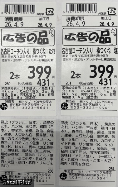 2026年3月24日-2026年4月7日にトップ15店舗で販売した「名古屋コーチン入り棒つくね」において、製品ラベルの消費期限を「26.3.24-26.4.7」とすべきところ、誤って「26.3.28-26.4.11」と表示したため、リコール(自主回収)・返金する。これまで健康被害の報告はない。(リコールプラス編集部)