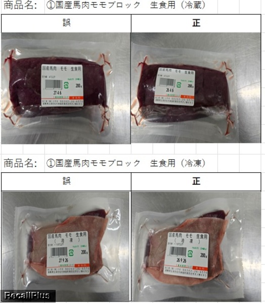 2026年3月30日-4月16日に、食肉専門店、飲食店等で販売した「国産馬肉32商品」において、製品ラベルの表示間違いにより賞味期限「2026年」と表示すべきところ「2027年」と表示したため、リコール(自主回収)する。これまで健康被害の報告はない。(リコールプラス編集部)