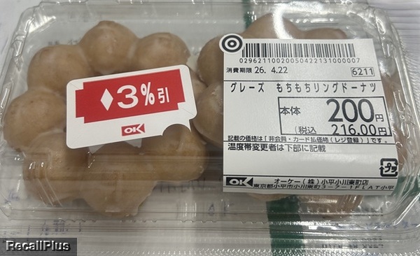 2026年4月18日-2026年4月21日に、オーケー株式会社9店舗で販売した「グレーズもちもちリングドーナツ」において、誤ったラベルを貼付したことにより、本来表示すべき原材料名、保存方法、アレルゲン表示(小麦・卵・乳成分・大豆)等の表示が欠落したため、リコール(自主回収)する。これまで健康被害の報告はない。(リコールプラス編集部)